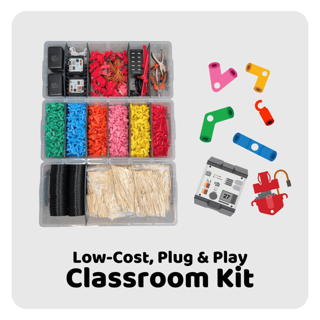 Each classroom kit contains enough geometric connectors, wooden chopsticks and plug & play electronics to build hundreds of ideas!